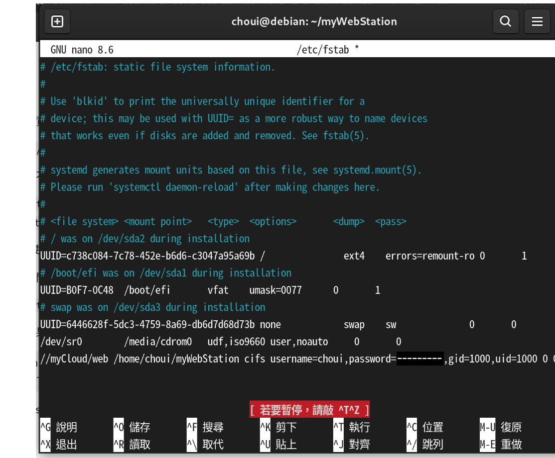 //myCloud/web /home/choui/myWebStation cifs username=choui,password=----,gid=1000 ,uid=1000 0 0 #網路資料夾掛載資訊
